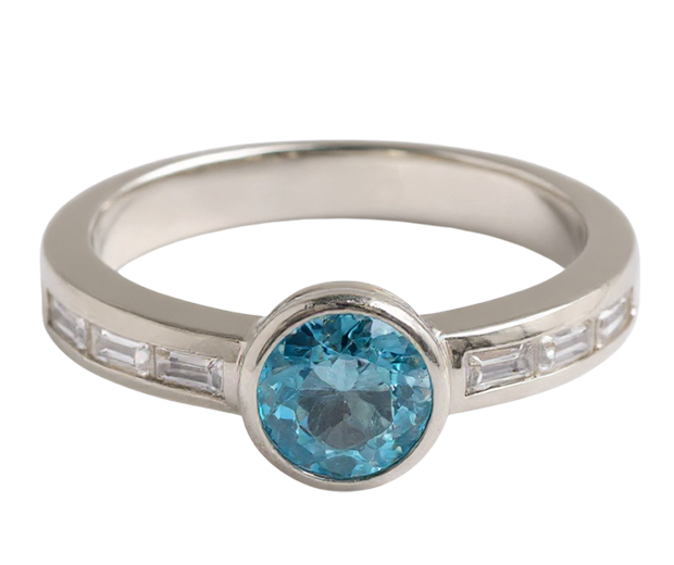 • Item Details: Crafted in Silver (925), this ring is made in Ring Size 55 and features a sleek 2.90 mm band. It is designed with one round mixed-cut Blue Topaz measuring 6.00 mm, bezel set for a smooth and modern finish. Six rectangular baguette-cut White Sapphires measuring 3.00×1.00 mm are channel set as supporting stones, adding a clean and structured detail. A refined design with a contemporary and elegant look.